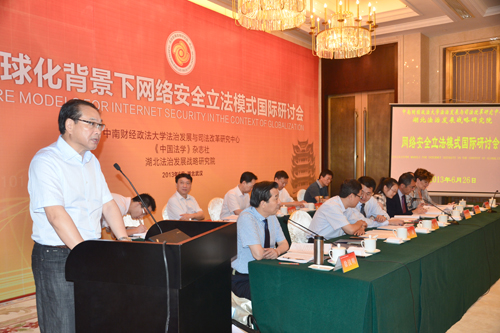 6月26日上午,由中南財(cái)經(jīng)政法大學(xué)法治發(fā)展與司法改革研究中心暨湖北省法治發(fā)展戰(zhàn)略研究院、《中國法學(xué)》雜志社聯(lián)合主辦的“經(jīng)濟(jì)全球化背景下網(wǎng)絡(luò)安全立法模式國際研討會(huì)”在武昌東湖國際會(huì)議中心召開。省人大常委會(huì)副主任王建鳴,中南財(cái)經(jīng)政法大學(xué)校長、中心-研究院學(xué)術(shù)委員會(huì)主席吳漢東教授,工信部信息安全協(xié)調(diào)司司長趙澤良等出席會(huì)議并致辭祝賀,來自國內(nèi)大專院校、科研單位的專家,以及澳門、意大利等境外專家學(xué)者作學(xué)術(shù)交流。
