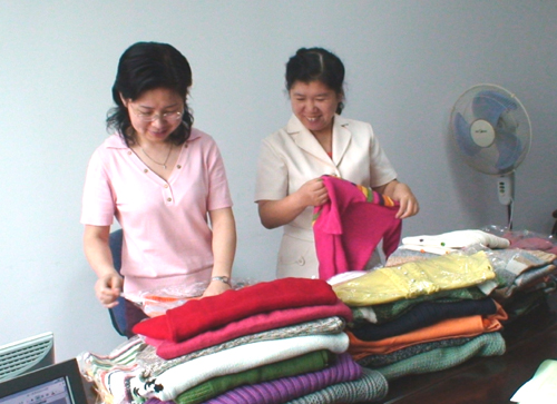 省政協(xié)機關的“愛心媽媽”們正在整理大家編織、捐贈的愛心毛衣