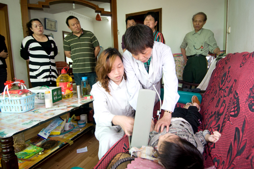 委員們來到腦癱兒童劉鑫的家中,為其送來食用油、雞蛋、牛奶等生活物資。劉鑫的父母長期不在身邊,由外公、外婆照料,因先天性腦癱,身體很虛弱。市政協(xié)委員、五醫(yī)院兒科主任陳新霞與同事對劉鑫進(jìn)行了聽診和按摩理療,并囑咐兩位老人要堅定信心,加強孩子的康復(fù)訓(xùn)練,爭取早日康復(fù)。